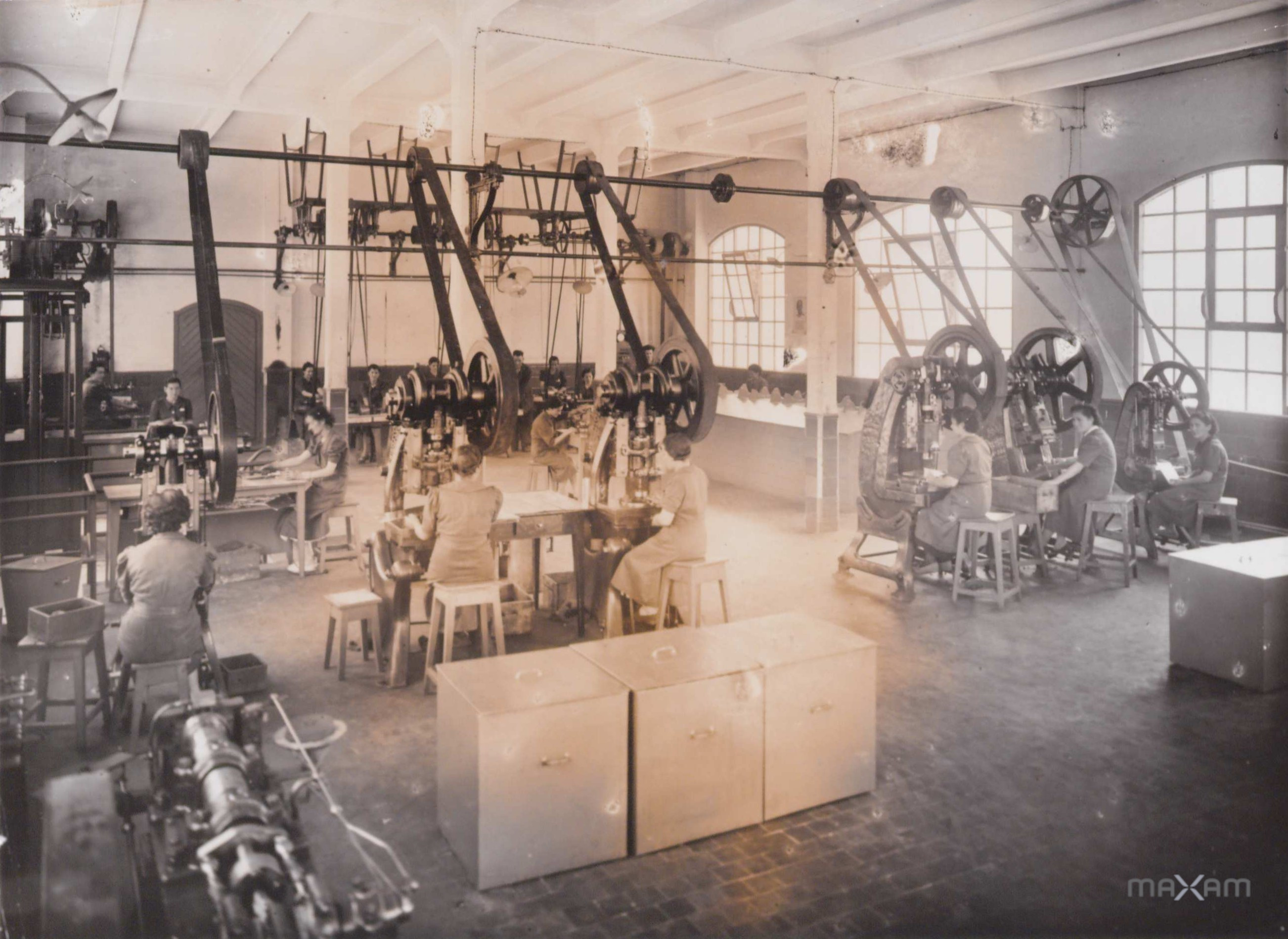 Vista del taller de preparación de casquillos de cobre para los cebos. En la fotografía se observan las trabajadoras denominadas Las Dinamiteras.