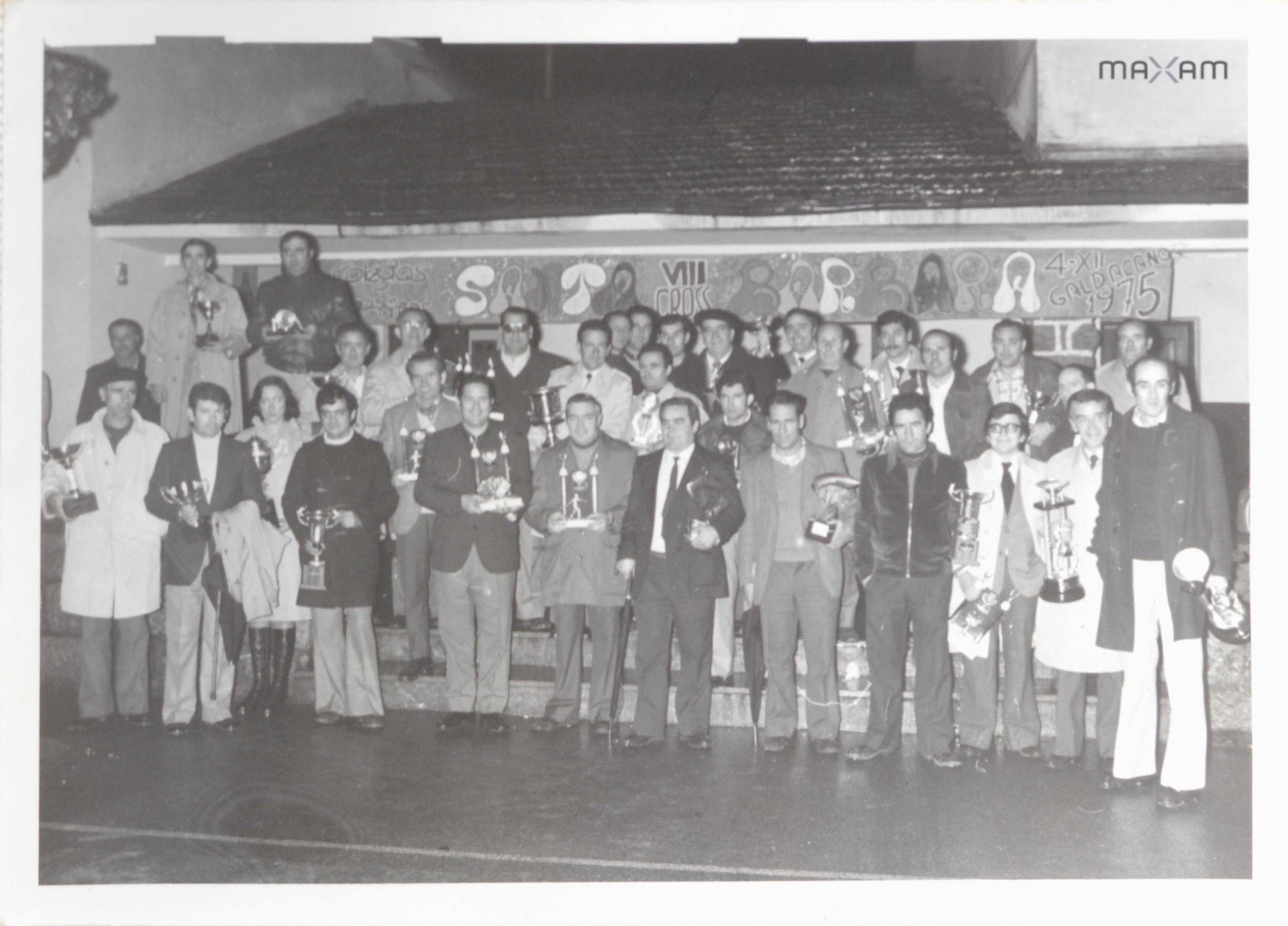Fotografía de la entrega de premios de las diferentes actividades que se realizaban con motivo de la Fiesta de Santa Bárbara. Se observa a un grupo de más 30 adultos con sus trofeos en la mano.