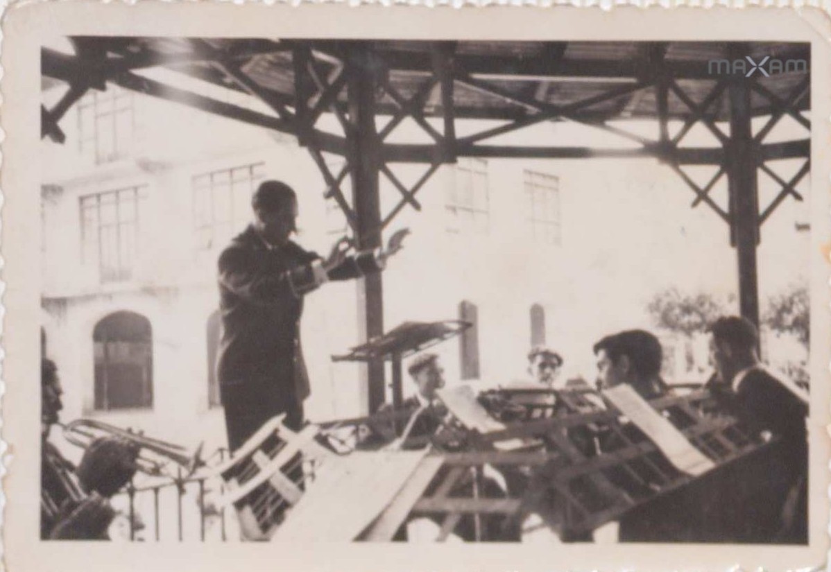 Fotografía de la Banda de Música de la Fábrica de Dinamita de Galdakao dando un concierto en un kiosko. Se observa a parte de la banda y al director dando instrucciones.