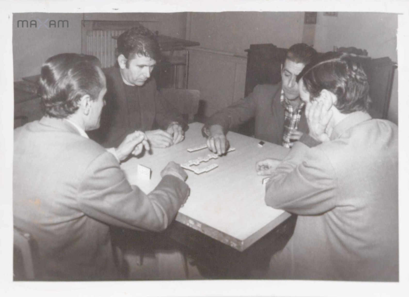 Langileen jolas-zirkuluaren barruko argazkia. Bertan, mahai baten inguruan, dominoan jolasten ari diren 4 gizon ikusten dira.