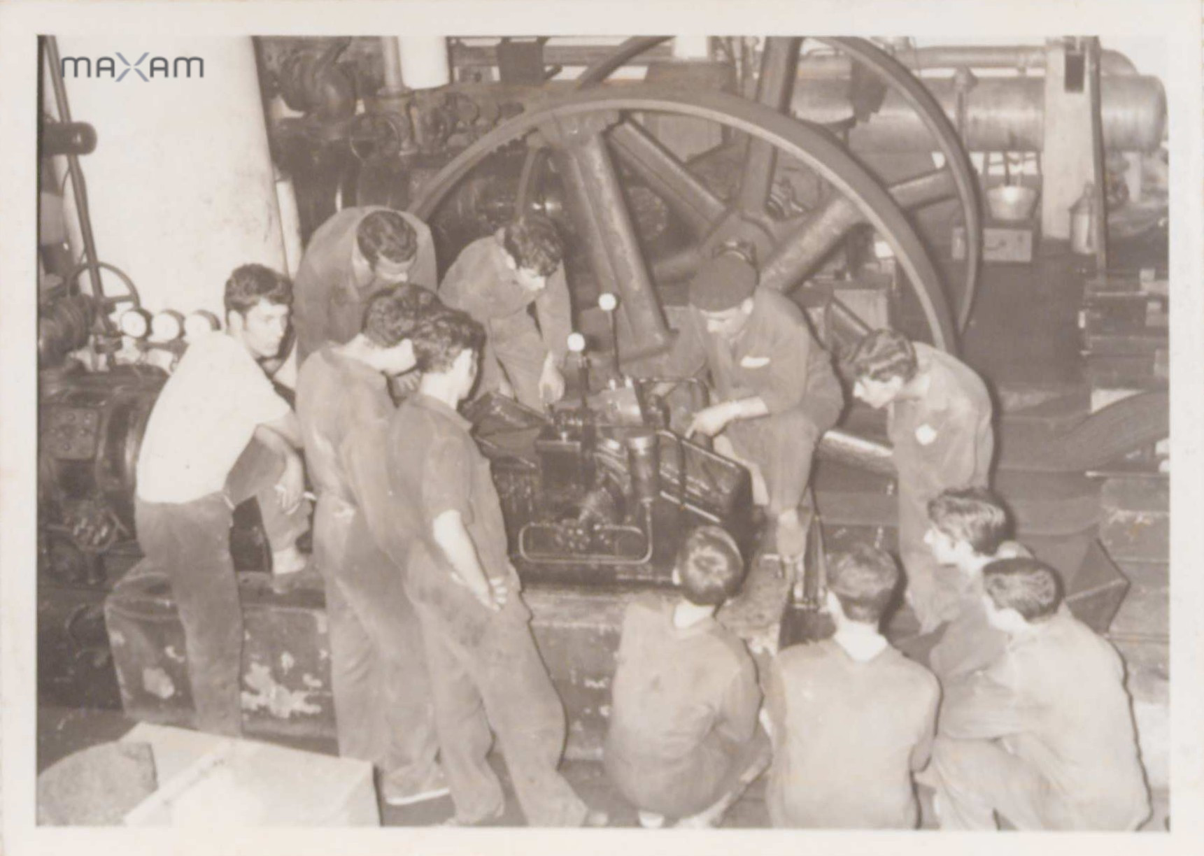 Argazkian, ikastun batzuk eta irakasle bat ageri dira, makina baten inguruan. Ikastunak irakaslearen azalpenei kasu egiten ari dira.