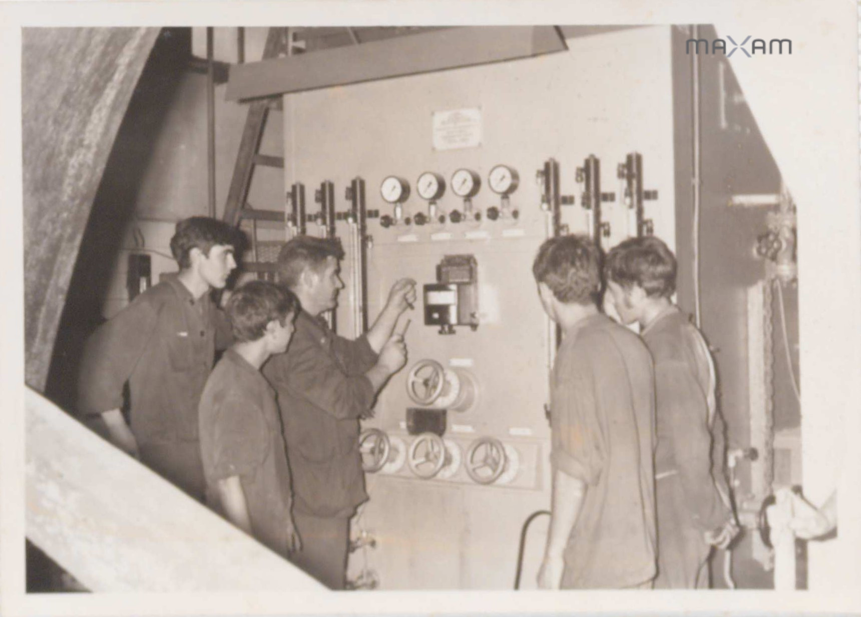 Fotografía varios cuatro aprendices y un profesor observando el panel de una máquina. Los aprendices están atendiendo a las explicaciones del profesor.