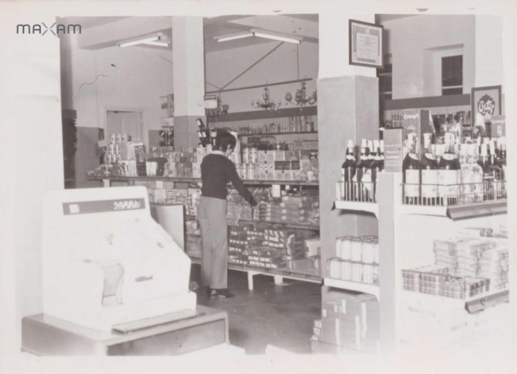 Kontsumo Kooperatiba barruko argazkia. Supermerkatua eta pertsona batek erosketa nola egiten duen ikus daiteke.